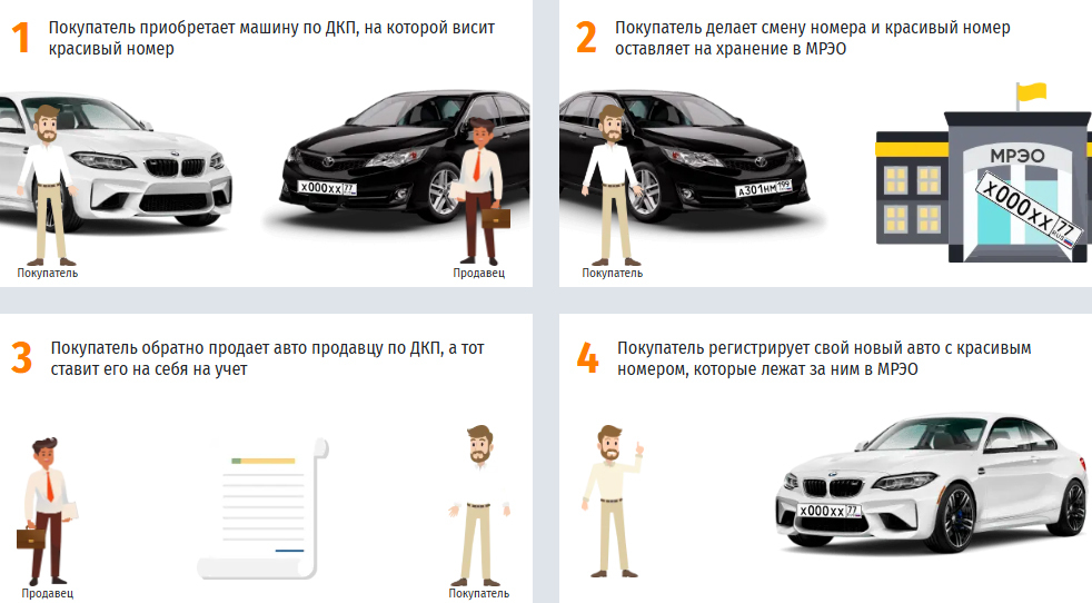 Передача номера осуществляется путем передачи (продажи) автомобиля. Наиболее популярная схема представлена ниже, но покупатель также может продать (временно передать) свой автомобиль продавцу.